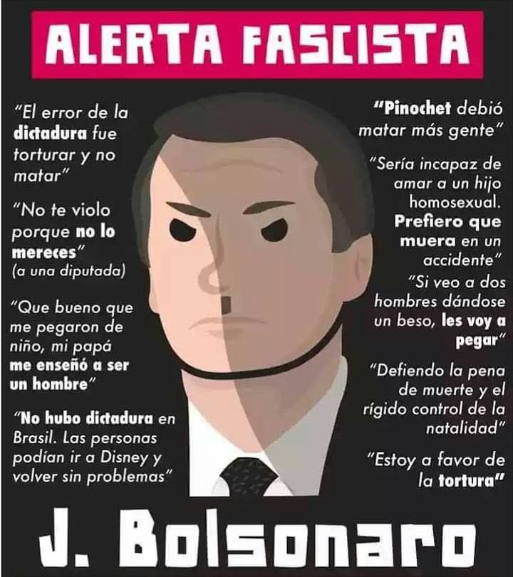 Bolsonaro, como la mayoría de sus seguidores no es un fascista, sólo adopta sus formas y ropajes. No entiende mucho mas allá de sus impulsos e intereses, le falta ideología, le falta el proceso intelectual y doctrinal que lleva a un proyecto como el fascismo. Bolsonaro es un gorila militar, un dictador con sueños de gloria. Y para ello no le faltan recursos, su discurso simplista, ofensivo y machista enamora a sus seguidores que se sienten identificados con su culto a la violencia y al terror y con sus mentiras fáciles de digerir. Racista, xenófobo, homofóbico, misógeno, machista, ultraconservador, con sus alabanzas a la dictadura militar, a la tortura y al asesinato de los opositores, pronto cautivó al gran capital, a las clases medias y a las Fuerzas Armadas. Son estos sectores los que sí son fascistas y saben cómo utilizar sus herramientas sociales.