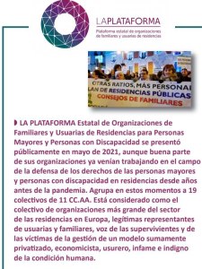Las principales organizaciones de familiares y usuarias de residencias para personas mayores y personas con discapacidad de todo el Estado español, integradas en LA PLATAFORMA Estatal, convocamos una manifestación única en Madrid el próximo sábado 17 de septiembre para denunciar que en estos centros se están vulnerando reiteradamente los derechos humanos y los derechos fundamentales y constitucionales de las usuarias, además de quebrantarse los derechos laborales de las trabajadoras.